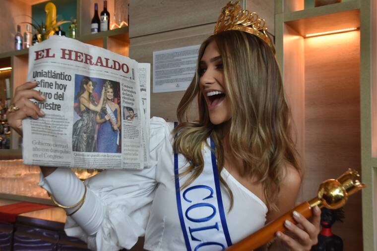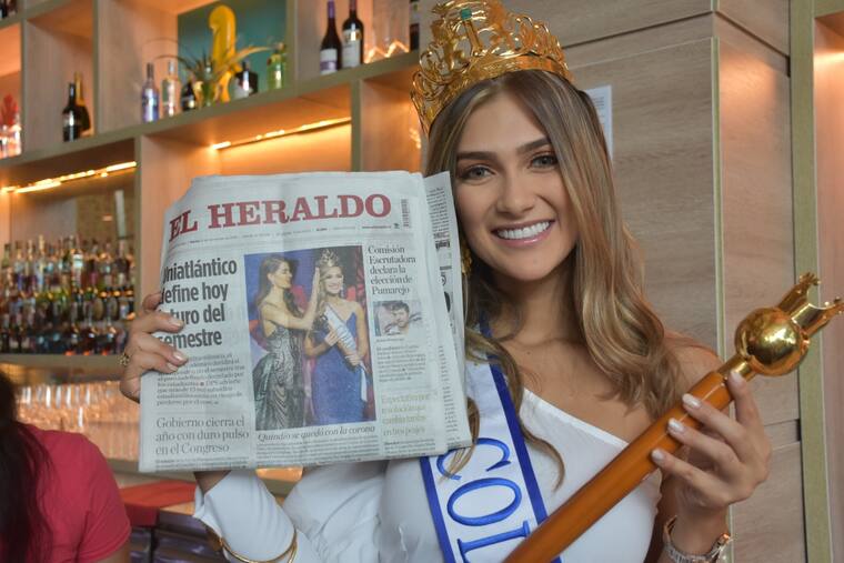 La nueva Señorita Colombia, María Fernanda Aristizábal, atendió a los medios de comunicación en su primer día en el hotel Hilton de Cartagena y agradeció a todos por el apoyo brindado. Uno de los momentos más llamativo fue cuando tomó el diario para posar.