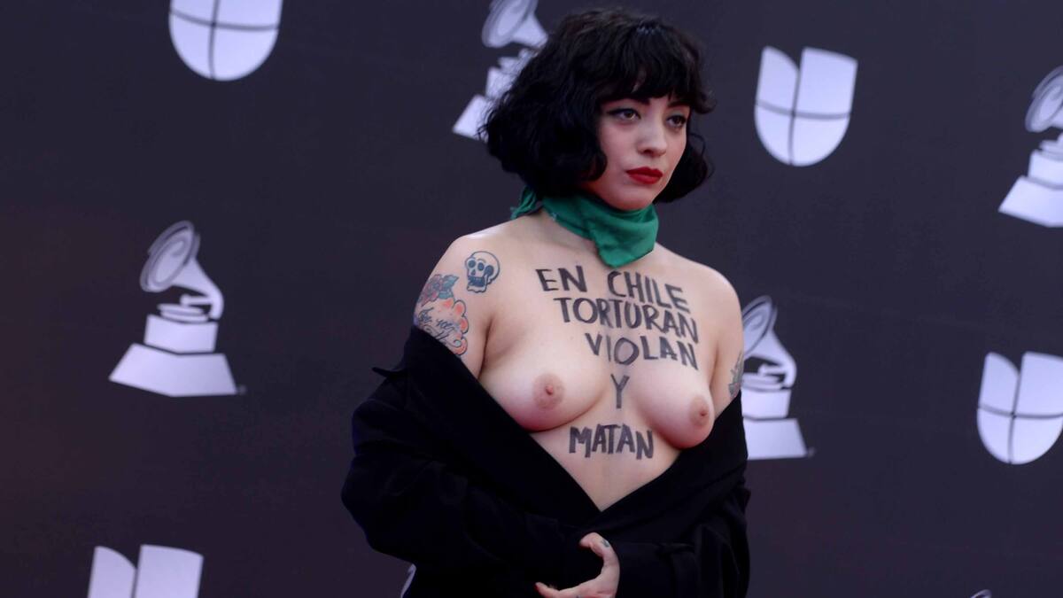 La cantante chilena Mon Laferte posó este jueves con los pechos desnudos en la alfombra roja del Grammy Latino con el mensaje 'En Chile torturan, violan y matan' escrito en letras negras y mayúsculas. Un pañuelo verde, símbolo de la lucha por la legalización del aborto, rodeaba su cuello.