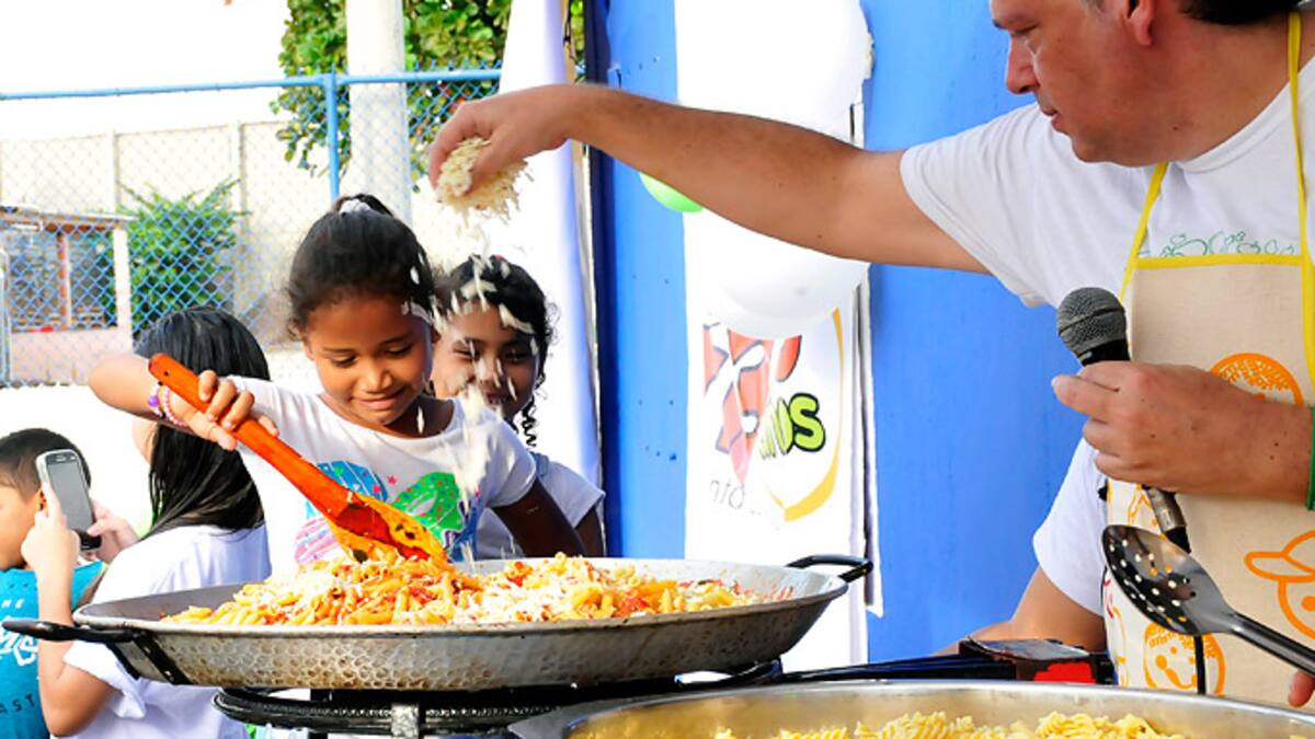 Durante la preparación de la salsa, receta que incluye tomates, albahaca, ajo, queso mozzarella -el cual fue reemplazado por queso costeño para demostrar que se puede cocinar con ingredientes económicos-, sal y un poco de azúcar, niños y mamás del barrio Villanueva ayudaron a los chefs a poner los ingredientes a cocinar y a revolver cuando fuese necesario.