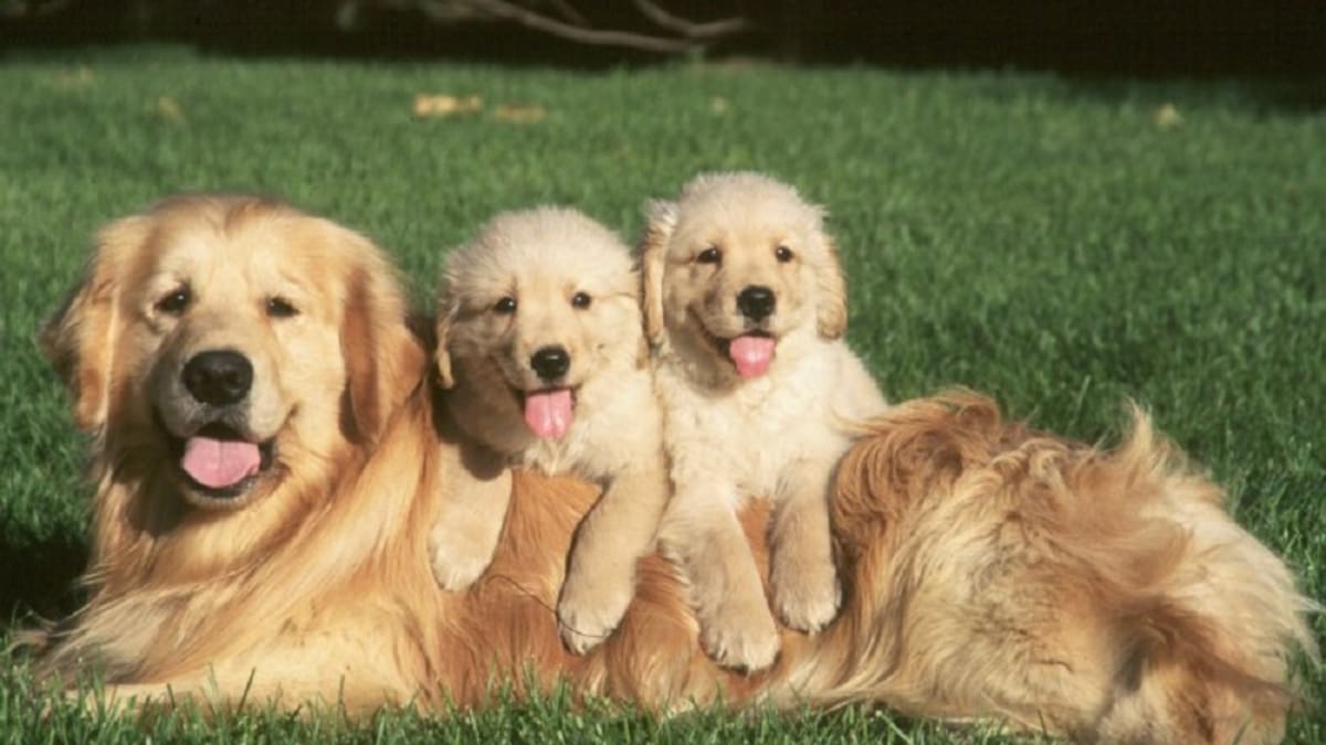 El perro que se encuentra junto a su cachorro no deja que el hombre que se observa parcialmente se acerque a tocarlo.