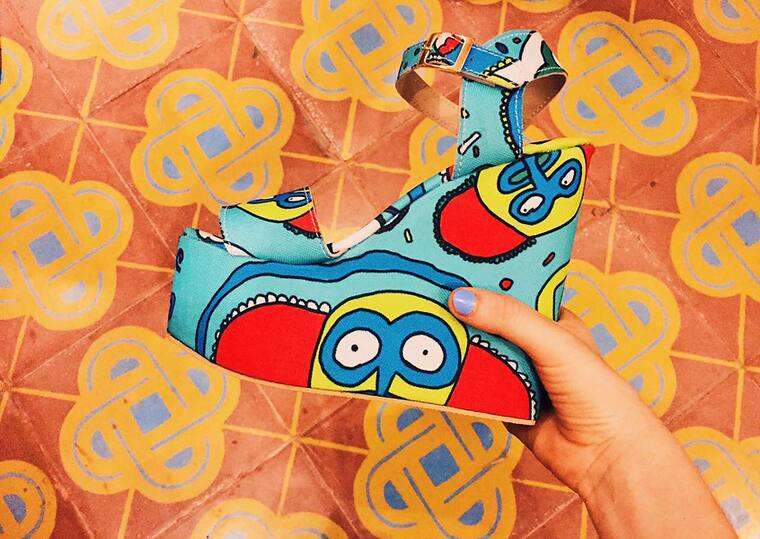Por esto, sus alpargatas y plataformas, que se pueden adquirir en @efecebaiefece, muestran a los coyongos, al son de negro y a la negrita puloy. 'Las telas las ilustro digitalmente, son piezas únicas. Las suelas son modeladas especialmente en madera', agrega.