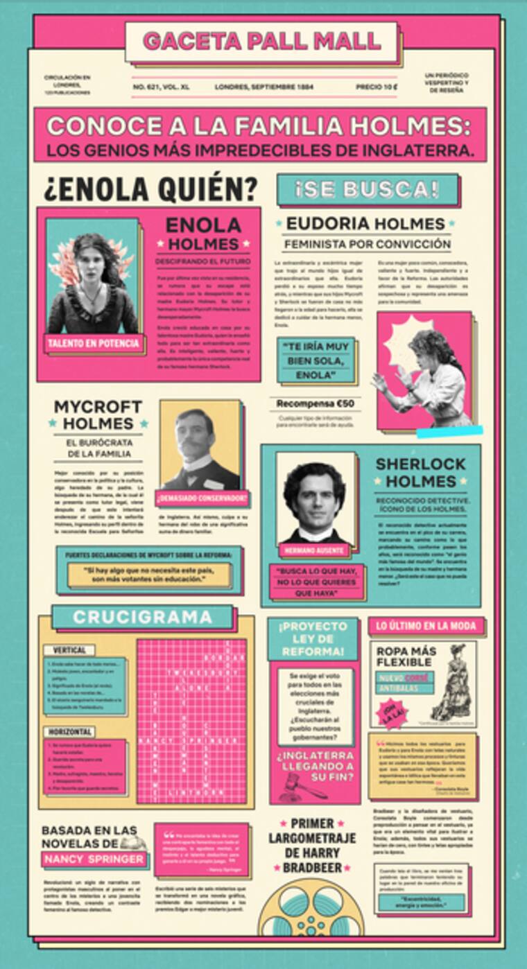 Protagonizada por Millie Bobby Brown, la historia presenta a Enola Holmes, la brillante, ingeniosa y vivaz hermanita de Sherlock y una detective en ciernes por derecho propio.