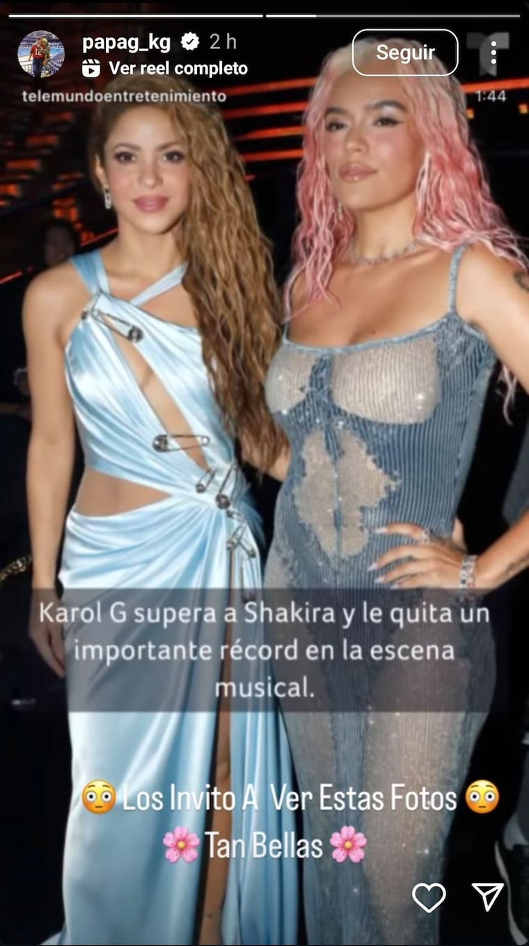 Pero no solo sus fanáticos se alegraron por este logro, porque su padre, Guillermo Giraldo, conocido como ‘Papá G’, también celebró la noticia con una foto de Karol y Shakira en sus historias de Instagram.