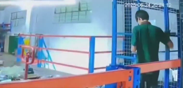 Un trabajador, aparentemente distraído con su celular, terminó cayendo por el hueco de un ascensor de carga, en un momento que quedó registrado por las cámaras de seguridad de la empresa.