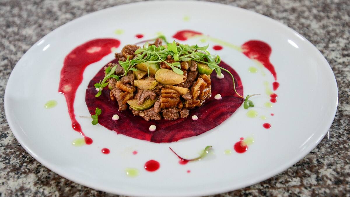 Con cuidado, se adiciona la combinación de la carne sobre la cama de remolacha. La mezcla Borsch se adiciona alrededor del plato para brindarle color y un sabor acidulce. Se decora con aceite de cebollín, kéfir alrededor de la carne, cilantro y repollo morado.