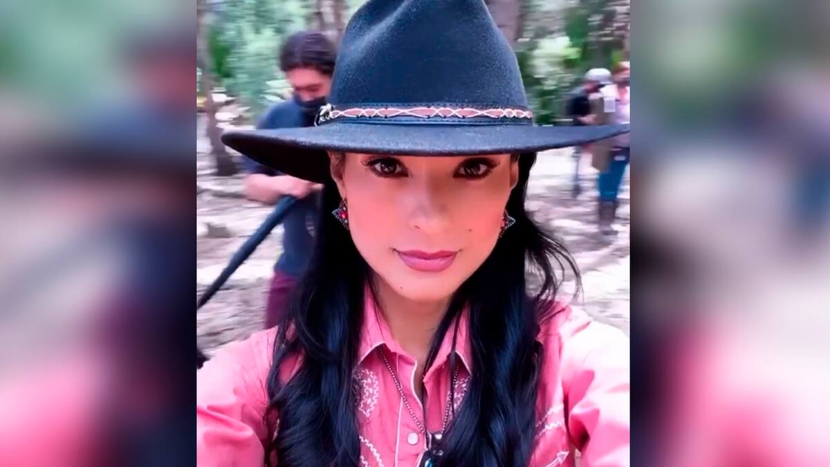 En el audiovisual la actriz viste un sombrero y en el fondo algunos caballos y elementos de producción saltan a la vista.