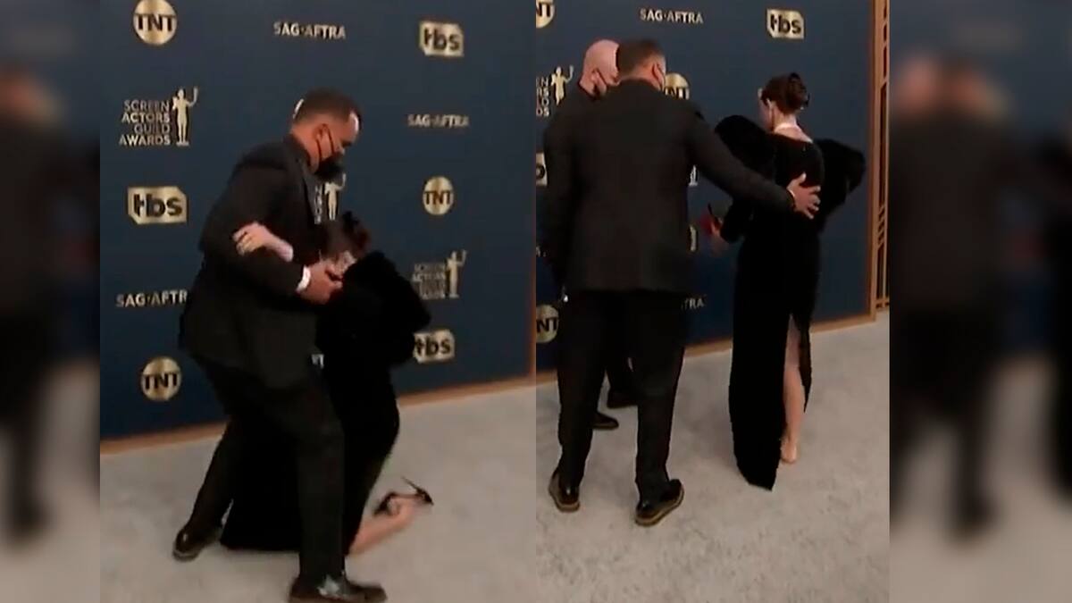 La actriz y modelo se hizo viral en redes sociales debido a que se observa en video cómo no pudo mantener el equilibrio debido, según se observa, a la mala pasada que le jugaron los zapatos de tacón que llevaba consigo en medio de la alfombra roja de los Premios SAG.