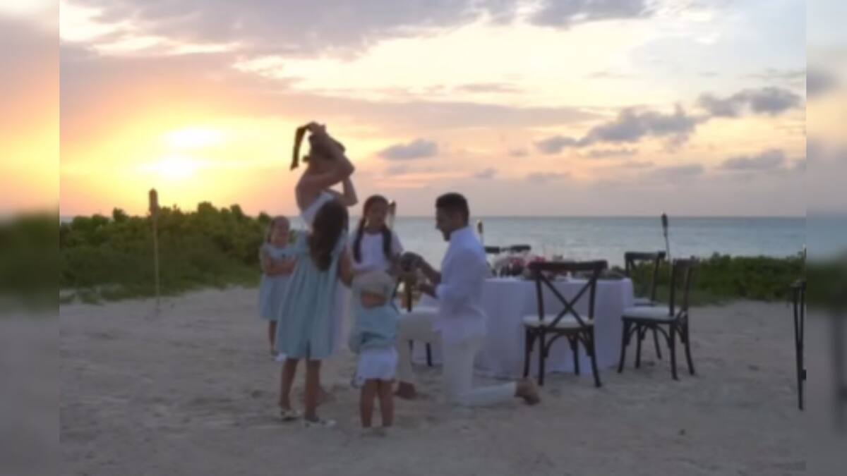 En el clip se puede apreciar un bello atardecer en la playa con antorchas, flores, y hasta champagne. Luego, se ve al samario arrodillado dándole el anillo a su esposa y sus hijos alrededor les dan un abrazo.