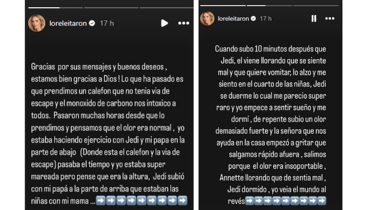 'Prendimos un calefón que no tenia vía de escape y el monóxido de carbono nos intoxicó a todos. Pasaron muchas horas desde que lo prendimos y pensamos que el olor era normal', escribió Tarón en su cuenta de Instagram.