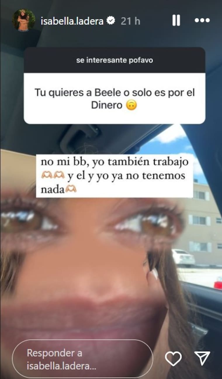 En una dinámica de preguntas y respuestas, una seguidora le puso: “¿tú quieres a Beéle o solo estás con él por el dinero?”, a lo que Isabella le contestó: “No, mi bebé. Yo también trabajo, y él y yo no tenemos nada”.