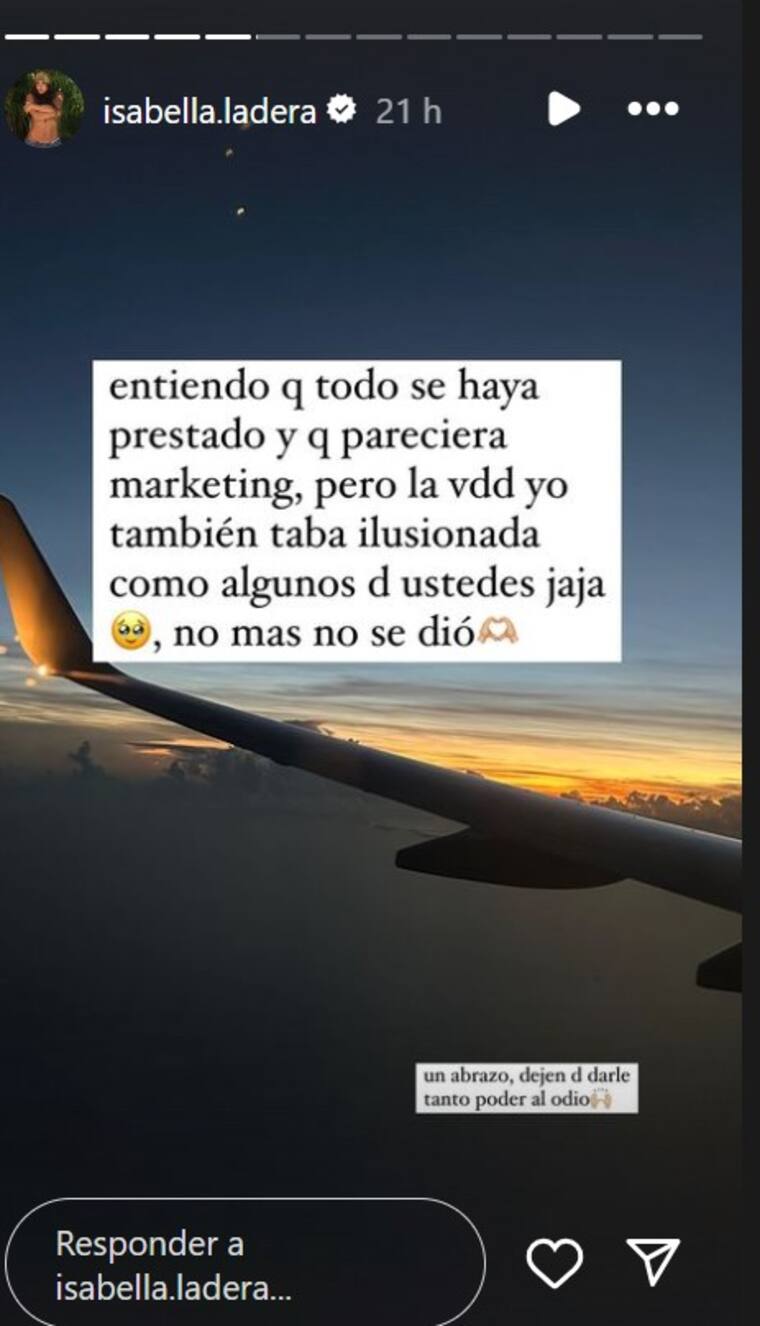 Varios de sus seguidores insinuaron que se trataba de puro marketing para lanzar la canción, pero ella también reveló que no fue así. “Entiendo que todo se haya prestado para marketing, pero la verdad yo también estaba ilusionada como algunos de ustedes, jaja. Pero no se dio”.