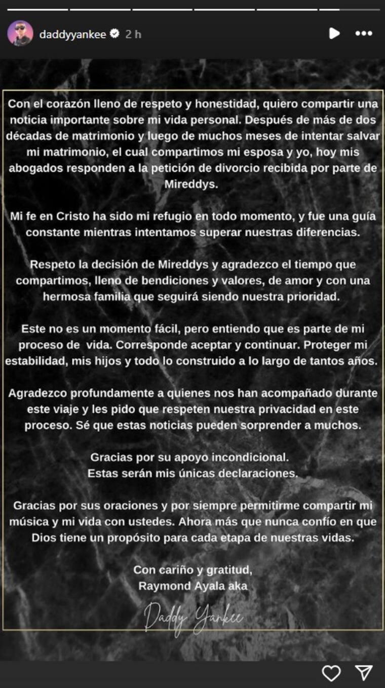El reconocido cantante puertorriqueño Daddy Yankee, cuyo nombre real es Raymond Ayala, confirmó este lunes su separación de Mireddys González, con quien compartió casi 30 años de matrimonio. La noticia fue dada a conocer a través de un comunicado publicado en sus redes sociales, específicamente en las historias de Instagram, donde expresó su postura frente a este proceso personal.