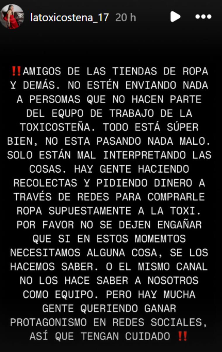 “Amigos de las tiendas de ropa y demás, no estén enviando nada a personas que no hacen parte del equipo de trabajo de La Toxi Costeña. Todo está súper bien, no está pasando nada malo. Solo están malinterpretando las cosas. Hay gente haciendo recolectas y pidiendo dinero a través de las redes para comprarle ropa supuestamente a La Toxi. Por favor, no se dejen engañar. Si en estos momentos necesitamos alguna cosa, se los hacemos saber”, escribieron.