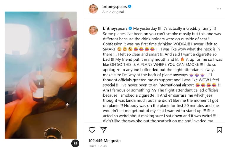 Instagram britneyspearsBritney Spears ofreció disculpas por fumar en un avión