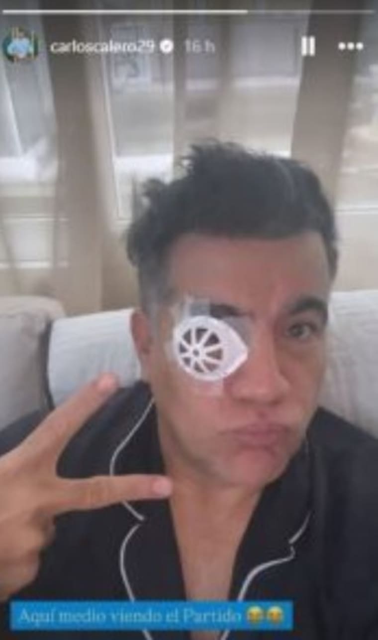 En la fotografía publicada a través de sus historias de Instagram, Calero aparece viendo un partido de fútbol mientras lleva un parche o protector en uno de sus ojos. Acompañó la imagen con la frase: “Aquí medio viendo el partido”.