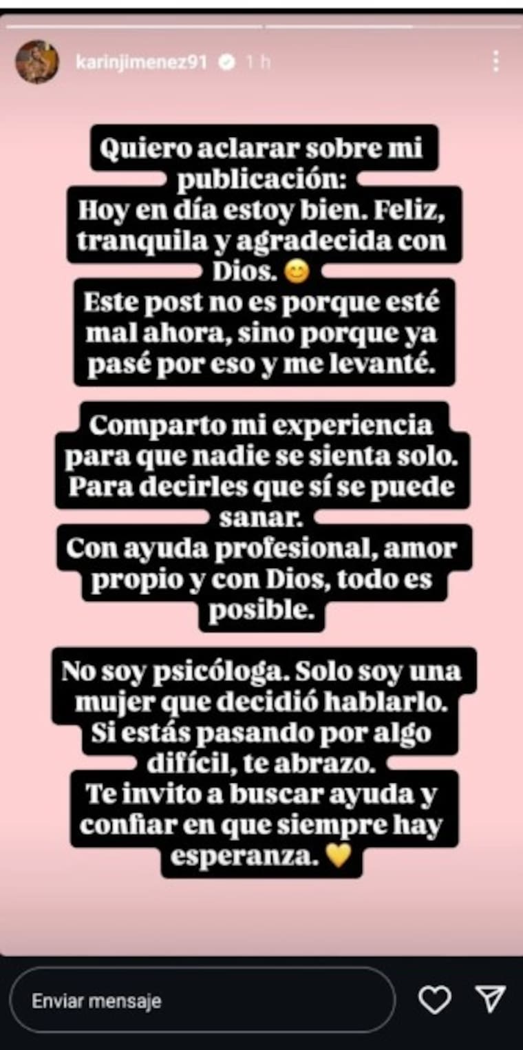 “Quiero aclarar sobre mi publicación: hoy en día estoy bien... Este post no es porque esté mal ahora, sino porque pasé por eso y me levanté. Comparto mi experiencia para que nadie se sienta solo. Con ayuda profesional, amor propio y con Dios, todo es posible”, comentó.