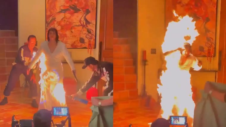 El video viral muestra a una mujer vestida de blanco participando en una escena donde su cuerpo es incendiado como parte de la producción. Sin embargo, segundos después, la situación parece descontrolarse.