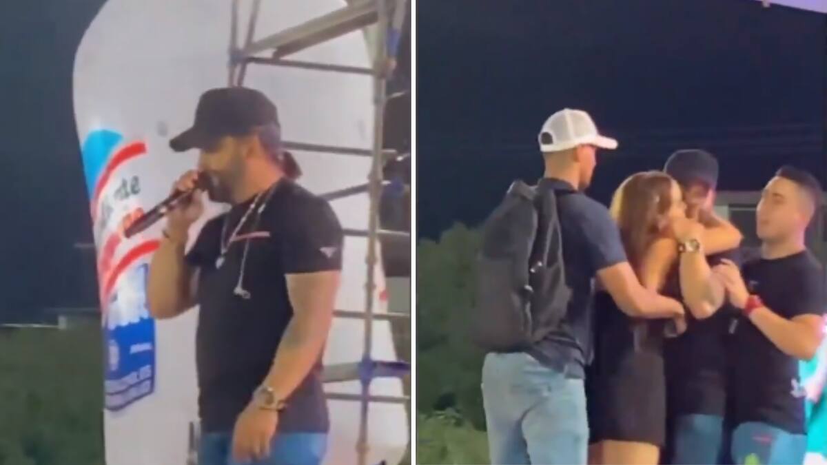 Mientras que el artista se encontraba interpretando la canción ‘Perdóname la vida’, uno de los éxitos más reconocidos de Los Inquietos, una mujer vestida de negro aprovechó la situación para burlar a los guardias y treparse a la tarima.