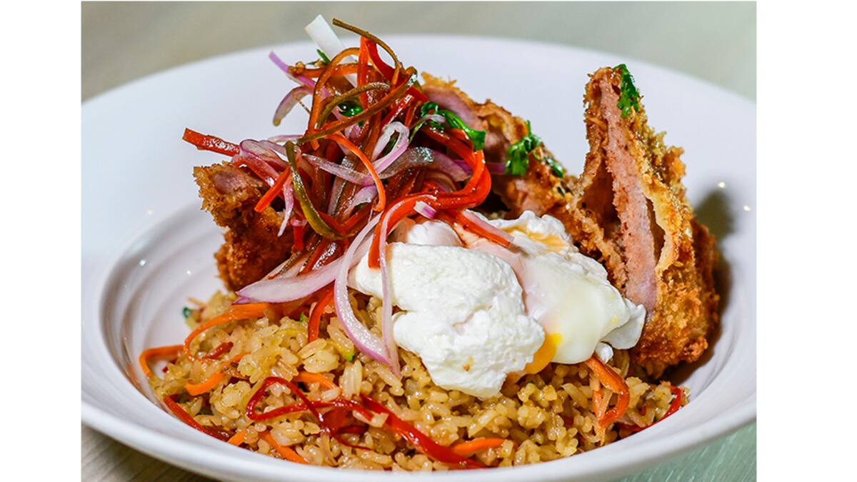Para emplatar, el chef recomienda que en un plato hondo ponga el arroz chaufa de base, luego cubra un costado con el lomo de cerdo, y el otro con el huevo preparado al gusto. Bañe la milanesa con la salsa chifera y decore con la ensaladilla de ají criollo.