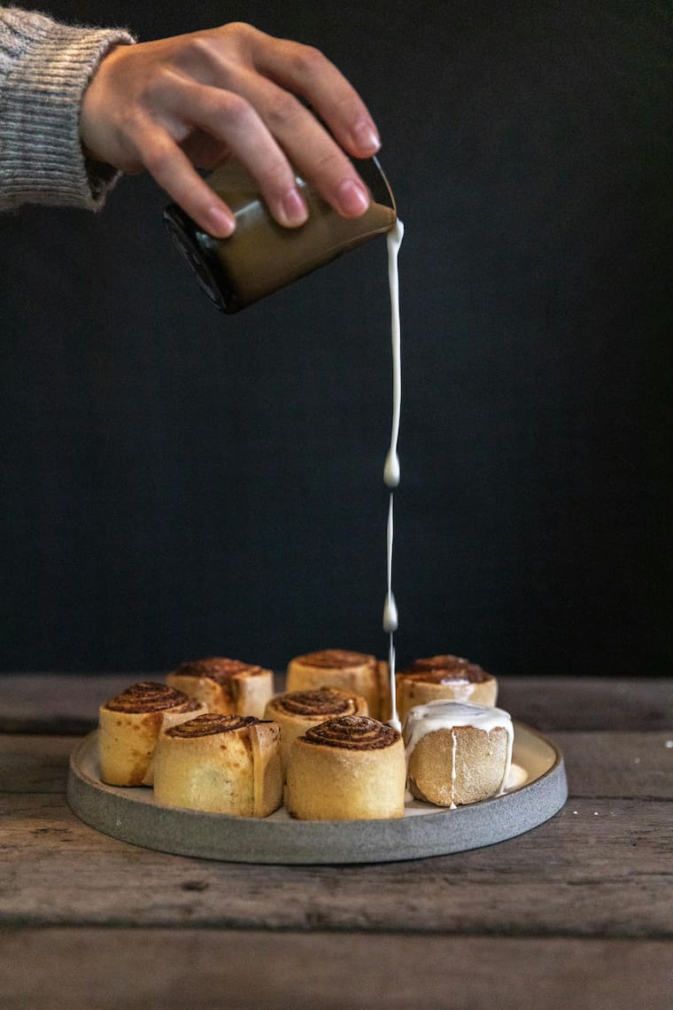 El relleno clásico consiste en una mezcla de mantequilla, azúcar moreno y canela. Una vez enrollada la masa y cortada en porciones, los rollos se hornean y muchas veces se cubren con glaseado de azúcar o crema de queso.