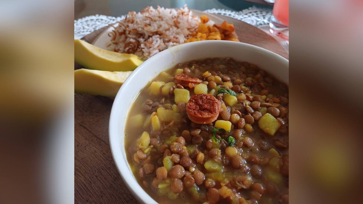 Finalmente adicione los tallos de cilantro y deje cocinar por 15 minutos más, sirva la cazuela de lentejas junto con arroz blanco, plátano maduro frito y aguacate.