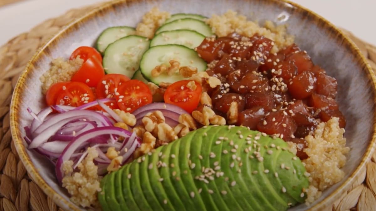 Paso a paso para preparar un bowl de atún con mango, pepino, zanahoria, tomate, aguacate y quinua, según ChatGPT.