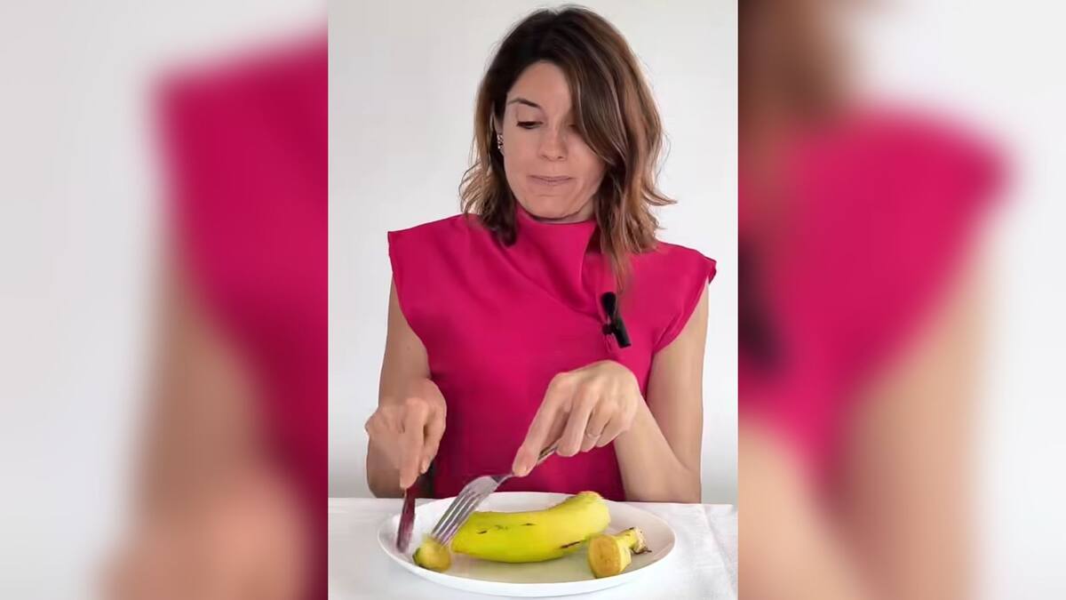 “El plátano, cuando estamos sentados en la mesa, no se come con las manos, que es lo primero que has pensado, sino utilizando los cubiertos: el tenedor y el cuchillo”, asegura la experta.