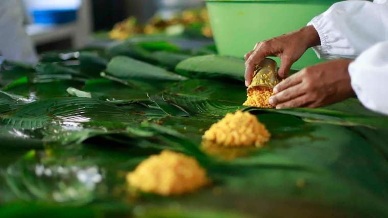 - Coloque porciones sobre las hojas de plátano.