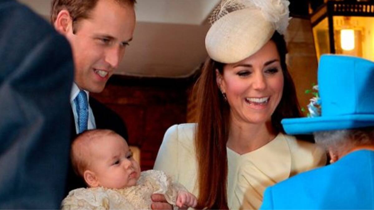 La reina Isabel II apareció hoy por primera vez en público con los tres futuros reyes de Inglaterra, su hijo Carlos, su nieto Guillermo y su bisnieto Jorge, en el bautizo de este último, de tres meses de edad.