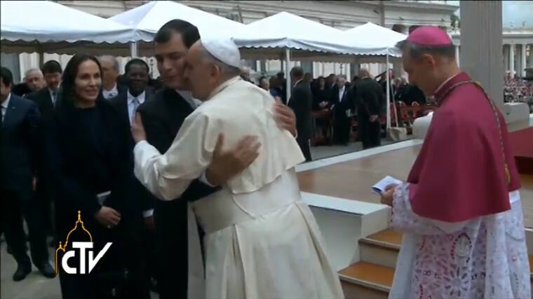Efusivo saludo entre Rafael Correa y el papa Francisco, al término de la canonización.