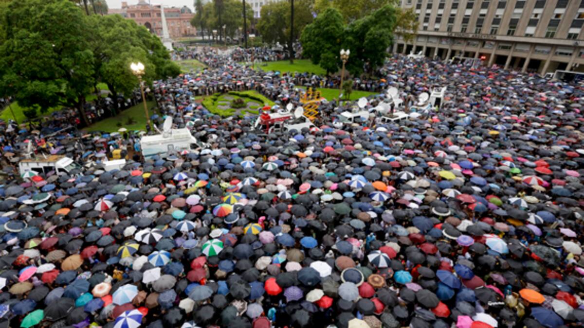 Con banderas argentinas y carteles blancos con las leyendas '¡Justicia!' y '¡Verdad!' escritas en negro, los manifestantes se dirigieron bajo una lluvia torrencial desde el palacio del Congreso hacia la emblemática Plaza de Mayo, frente a la Casa Rosada, sede del ejecutivo.