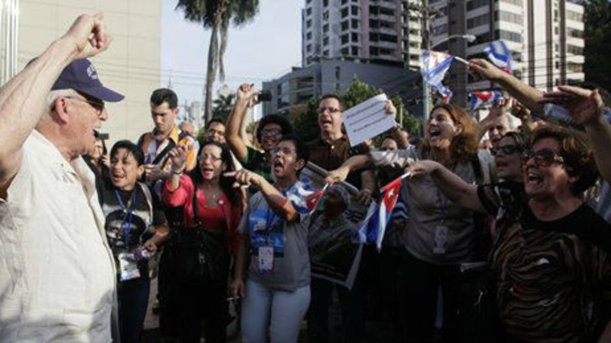 El miércoles cubanos simpatizantes de la revolución con banderas y cantando consignas también protestaron por la presencia de opositores invitados en el foro social y finalmente se retiraron del recinto inaugural pues no quisieron compartir 'el espacio' con disidentes a los cuales acusaron de no ser representantes legítimos de ningún sector en la isla, sino 'mercenarios' al servicio de los intereses de Estados Unidos en la isla.