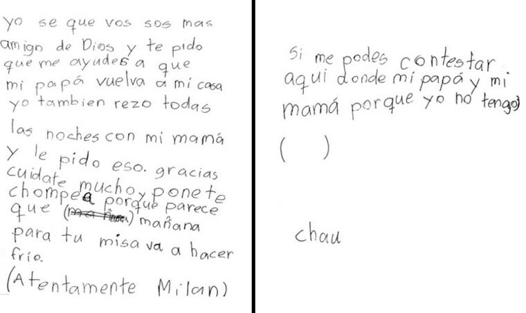 'Yo sé que vos sos más amigo de Dios y te pido que me ayudes a que mi papá vuelva a mi casa. Yo también rezo todas las noches con mi mamá y le pido eso. Gracias. Cuídate mucho y ponte chompa porque parece que mañana para tu misa va a hacer frío. Atentamente: Milan'.