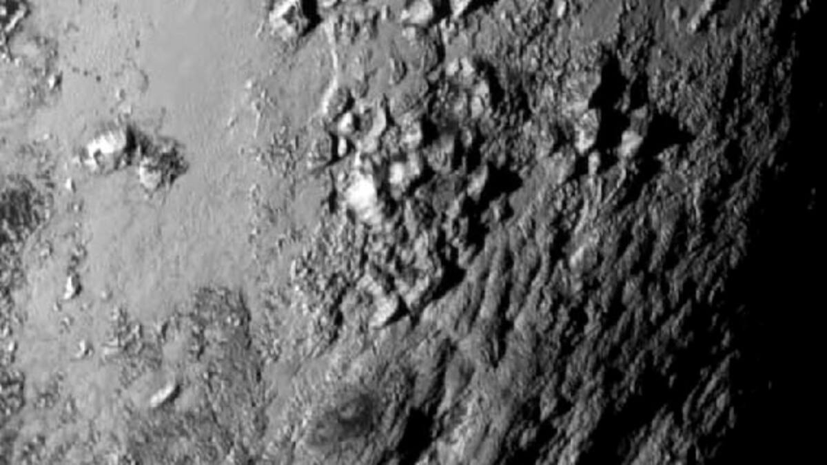 Un acercamiento a Plutón revela una cordillera helada tan alta como las Rocallosas. Para gran sorpresa de los científicos, no hay cráteres por impacto. En Caronte se pueden observar depresiones y cañones profundos.