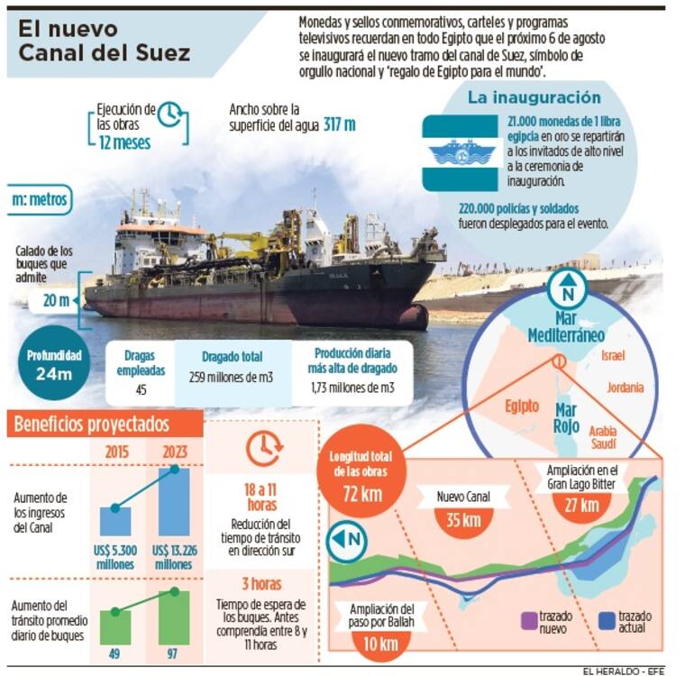 Egipto inauguró hoy el nuevo canal de Suez, con una gran ceremonia en la que el presidente egipcio, Abdelfatah al Sisi, aprovechó para ensalzar el orgullo patriótico y la lucha contra el terrorismo, al tiempo que prometió un mayor desarrollo económico para el país.