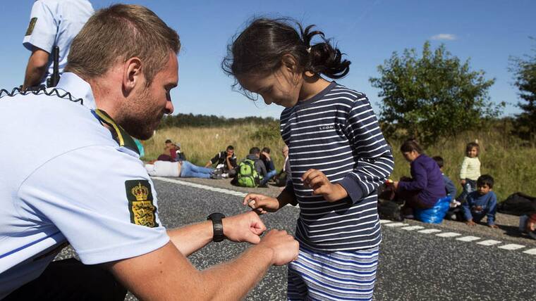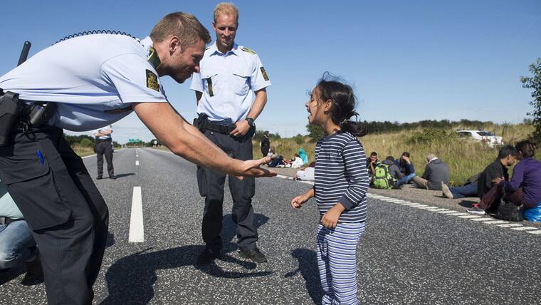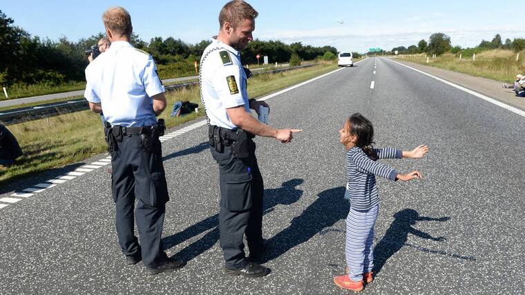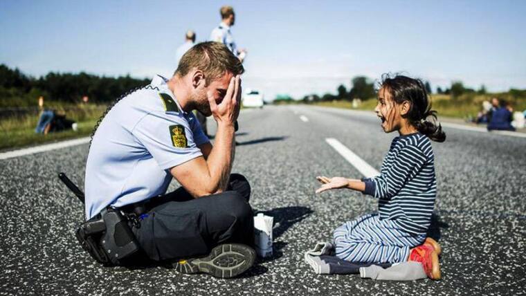 Una serie de fotografías de un policía danés y una niña siria jugando en medio de una autopista causaron reacciones en redes sociales y se viralizaron al mostrar un lado distinto de la situación de inmigración actual en Europa.