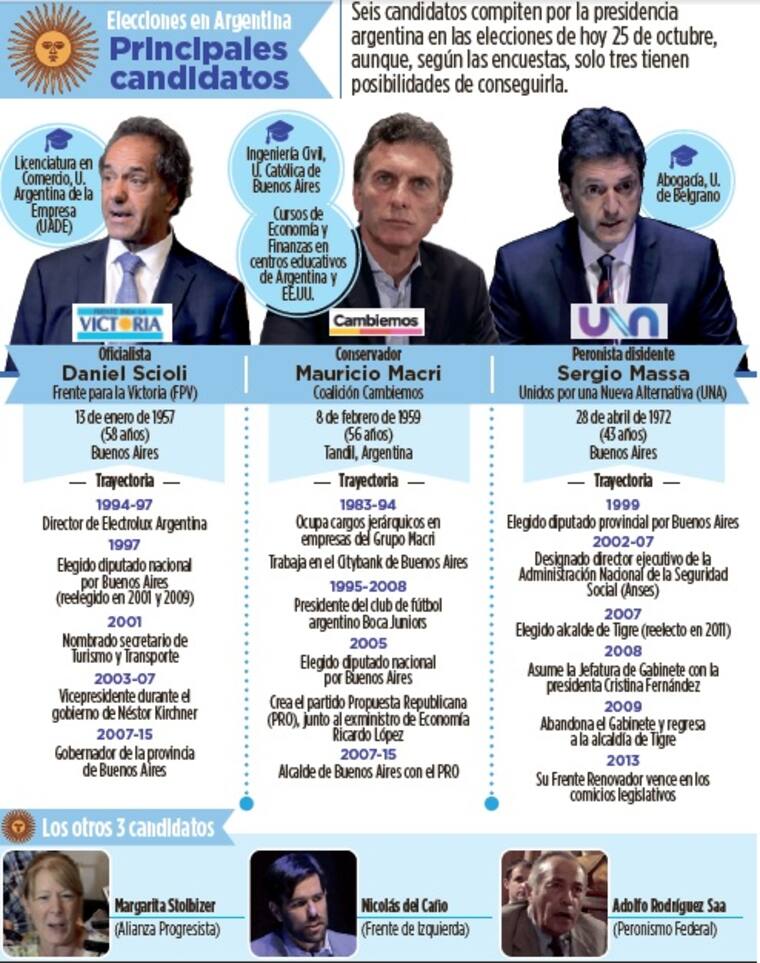 Las últimas encuestas hechas públicas antes de la veda electoral apuntan como favorito al oficialista Daniel Scioli, actual gobernador de la provincia de Buenos Aires, seguido del conservador Mauricio Macri, alcalde de la capital argentina, y el peronista disidente Sergio Massa.