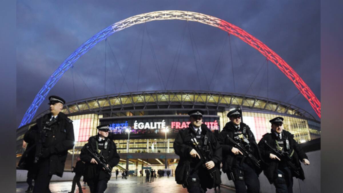 Policías ingleses custodian la entrada de estadio de Wembley, donde ayer se jugó un partido amistoso entre Inglaterra y Francia, cuatro días después de los atentados de París que cobraron 129 vidas. Antes de comenzar el juego, cerca de 80.000 espectadores entonaron a viva voz La Marsellesa, el himno nacional del país galo, en memoria de las víctimas de los actos