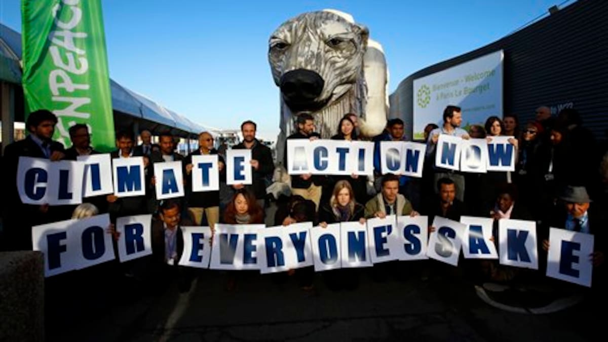 Activistas de Greenpeace llevaron el oso a la sede de las conversaciones el miércoles. Es una de las múltiples acciones de protesta que rodean a la cumbre de dos semanas auspiciada por la ONU.