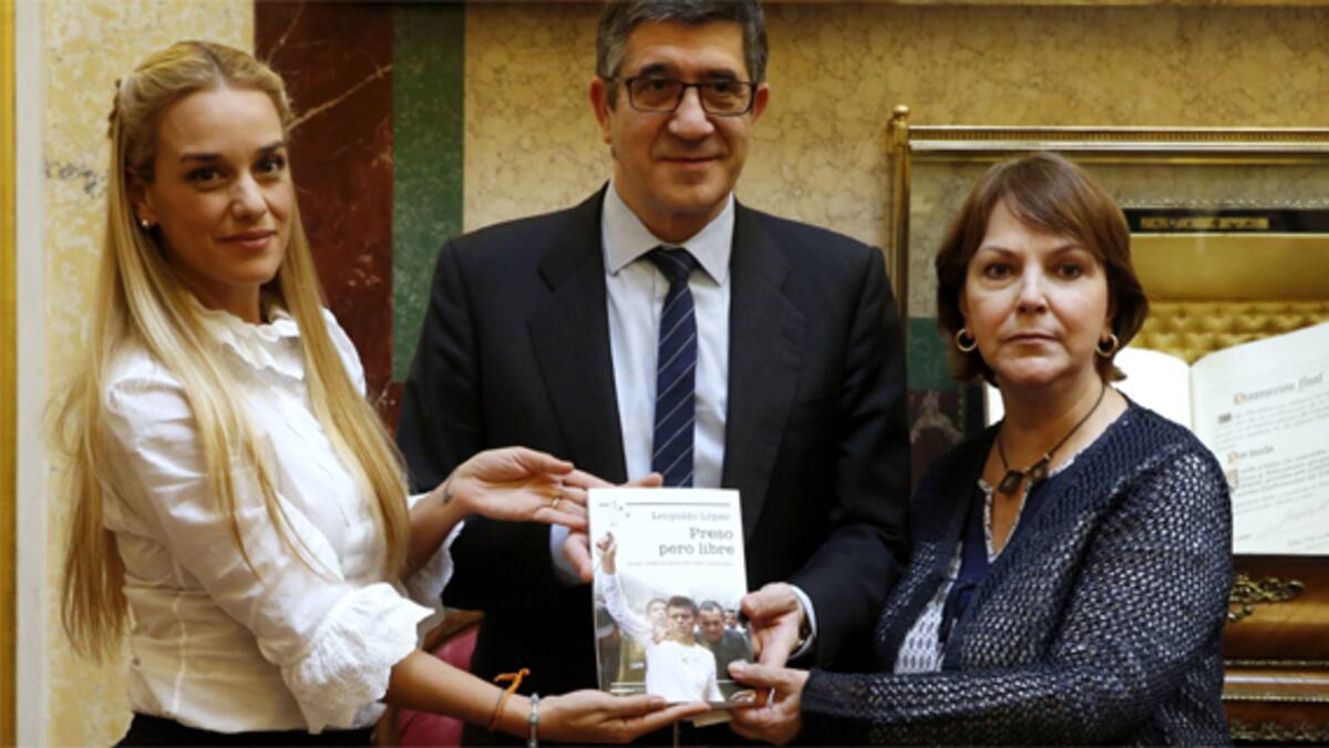La esposa de Leopoldo López está de visita en Madrid presentando el libro de su esposo titulado Preso pero libre, acompañada por Mitzy Capriles, esposa del exalcalde de Caracas Antonio Ledezma, en arresto domiciliario.