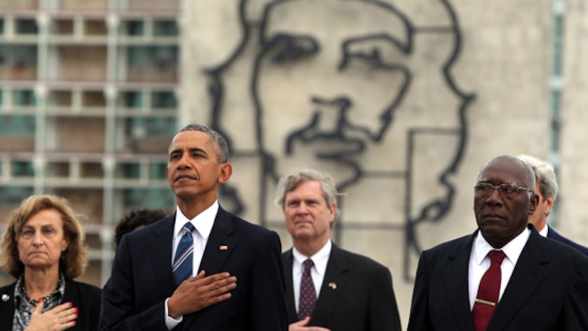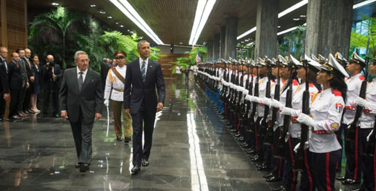 Castro recibió oficialmente a Obama en el Palacio de la Revolución,luego de que el mandatario estadounidense depositara una ofrenda florar a José Martí, el héroe nacional. En su segundo día en la isla, Obama se salió del protocolo y aprovechó para tomarse una fotografía desde el Memorial José Martí. Bajo el cielo encapotado y la potente brisa que llegó del norte con el frente frío, se alineó para una foto junto a su equipo bajo la mirada de los líderes revolucionarios Ernesto ‘Che’ Guevara y Camilo Cienfuegos, cuyos rostros figuran impresos a gran escala en los edificios en los que se concentra el poder del gobierno cubano.