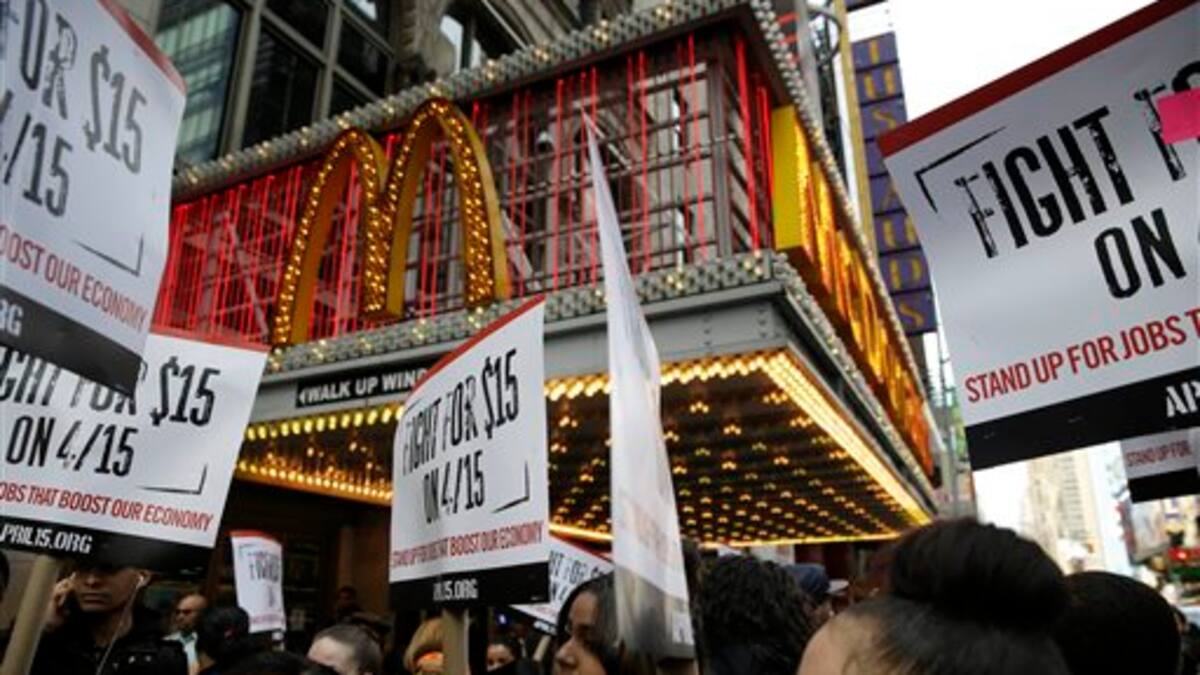 Trabajadores con bajos salarios —incluso empleados de aeropuertos, profesores adjuntos y otros— participaron en la campaña 'Fight for $15' para mostrar su solidaridad con los trabajadores del sector. Dicen que la campaña se centra en McDonald's por su capacidad para influir en las prácticas salariales en todo el sector.