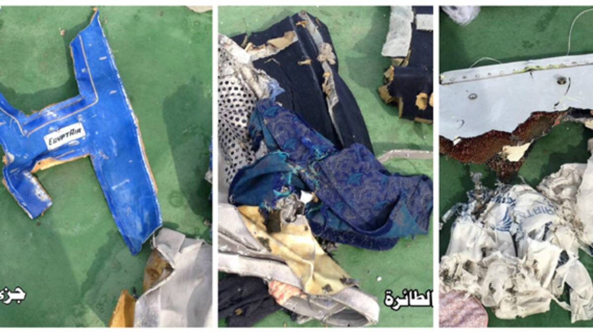 Fragmentos del avión con la marca de la aerolínea egipcia, partes de asientos y objetos personales de los pasajeros son algunos de los restos recuperados entre ayer y hoy por las fuerzas navales egipcias.