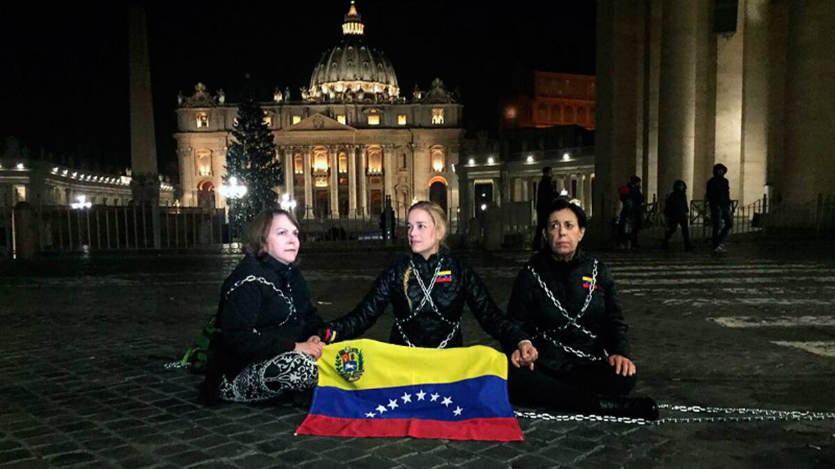 'El Vaticano es parte de un diálogo que ha empezado en Venezuela y ese diálogo no ha dado resultados', criticó Tintori, encadenada a una verja frente al Vaticano y con una bandera venezolana, una foto de su marido, de Ledezma y de todos los políticos presos a sus pies.