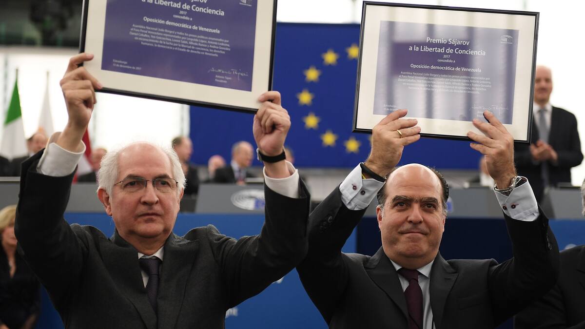 El presidente del parlamento de Venezuela, Julio Borges, y el exiliado ex alcalde de Caracas, Antonio Ledezma, recogieron el premio en Estrasburgo (noreste de Francia), con un llamado a la comunidad internacional para lograr una 'transición' en su país.