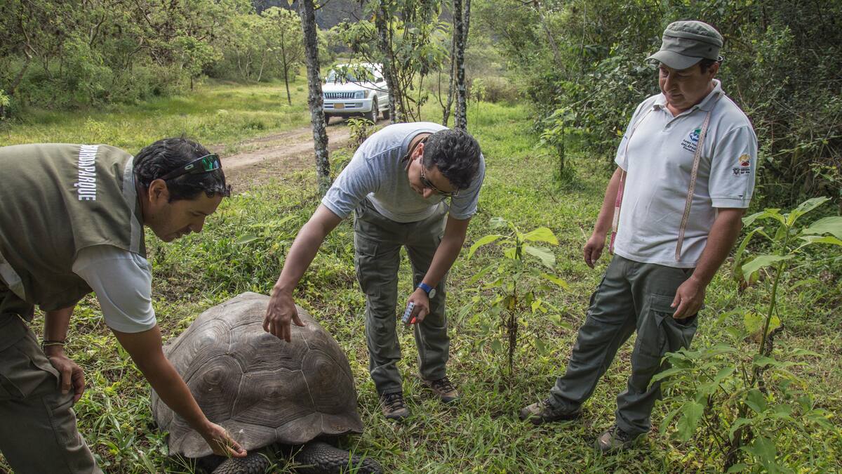 Sin protestar, la tortuga deja que los guardaparques le midan su enorme caparazón y, entre varios, le den la vuelta a su pesado cuerpo -de más de cien kilos- para inspeccionar su estado de salud.