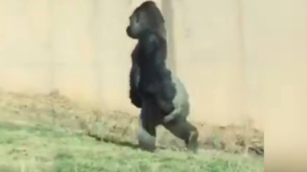 Un gorila residente del Zoológico de Filadelfia en Estados Unidos se ha convertido en sensación de las redes sociales debido a que fue grabado caminando por el lugar en dos patas mientras llevaba comida en sus manos.