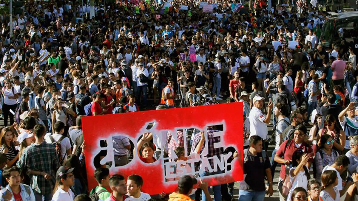 'No son tres, somos todos' y 'gobierno farsante, asesino de estudiantes', fueron algunas de las consignas que gritaron los miles de manifestantes en su trayecto a la Glorieta de los Niños Héroes, rebautizada como Glorieta Los Desaparecidos, en Guadalajara, la segunda mayor ciudad del país.