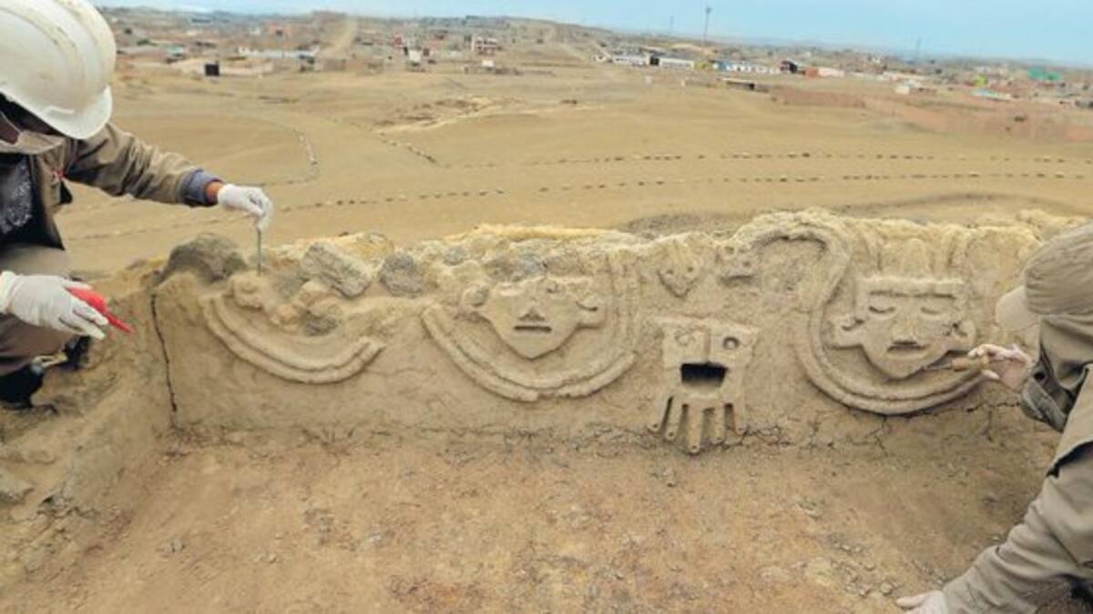 Un muro decorado en alto relieve con cabezas humanas, dos serpientes y una semilla, que tendría una antigüedad de 3.800 años, fue descubierta en el sitio arqueológico de Vichama, al norte de Lima, informó el jueves el ministerio de Cultura.