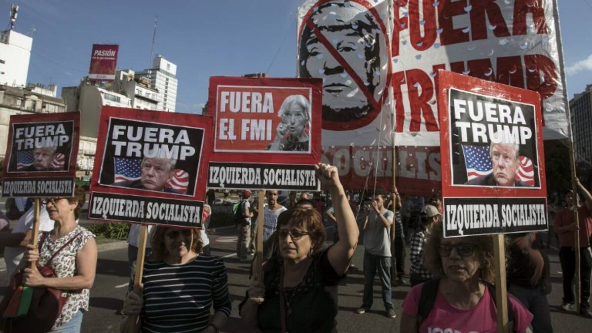 Con grandes pancartas con mensajes como 'Fuera Trump' y 'Fuera el FMI', los manifestantes recorrieron la céntrica avenida 9 de julio, cuyas calles adyacentes fueron bloqueadas con vallas metálicas custodiadas por unos 2.500 agentes y guardias de infantería.